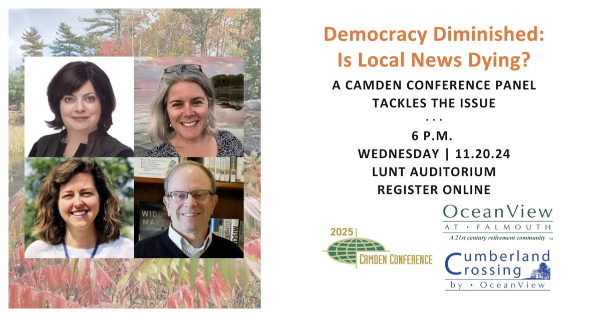 What are Maine’s leading news organizations doing to counter this trend? Lisa DeSisto, CEO and publisher of the Maine Trust for Local News, Maine Monitor Executive Director Micaela Schweitzer-Bluhm, and Bangor Daily News Director of Development Jo Easton at Lunt Auditorium, met in Falmouth on November 20 for an in-depth and timely discussion, moderated by former Boston Globe editor Matt Storin, hosted by OceanView at Falmouth and presented by the Camden Conference.
